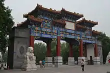 Yingze Park is located in downtown Taiyuan, Shanxi, China. It was opened to the public on June 1, 1957 and covers 63.28 hectares including its lake. It has over 390,000 ornamental plants in more than 10 gardens. Near the east gate is the Jin Merchant Museum, in the style of an ancient guild hall. In the park's center is the Cangjing Building, an 800-year-old structure transported from the Dongda Temple in Taigu. The north gate of the park features an ornate archway called "Beauty of Taiyuan" based on the style of the Yonghe Lama Temple in Beijing. The park also has recreational boating, arcade games, and children's playgrounds.
