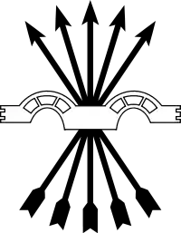 The yoke and arrows (Spanish: Yugo y flechas) or the yoke and the bundle of arrows (Spanish: Yugo y haz de flechas) is a badge dating back to dynastic union of the Catholic monarchs of Spain, Ferdinand II of Aragon and Isabella I of Castile. Subsequent Catholic monarchs continued to use it on their shields to represent a united Spain and as the "symbol of the heroic virtues of the race".[1]