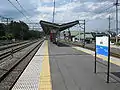 The station consists of one island platform serving two tracks, connected to the station building by a level crossing.