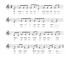 The song is often sung in a Scandinavian accent (e.g. j pronounced as y, w pronounced as v). This accent is revealed by the name "Yon Yonson", which when recited in American English is usually rendered "Jan Jansen" or "John Johnson". The Swedish pronunciation "Yon Yonson" probably dates the origin of the song to soon after the Swedes' arrival in the United States.[1]