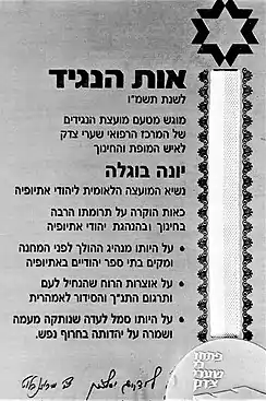 Because of his devotion to his people and his persistence in freeing them from oppression, Bogale has often been compared to Mahatma Gandhi, Nelson Mandela, Martin Luther King Jr. and Theodor Herzl.[1][2] In addition to his life’s work of returning the Beta Israelis to their homeland in Israel, he was a prolific author, editor and translator. Among other works, he published A "Falasha" Book of Jewish Festivals, an Amharic translation of portions of Pirke Avot and other prayer books, a Hebrew-Amharic dictionary, and translations of two 16th Century history books—all intended to give those Ethiopian Jews who were not proficient in Hebrew access to books in their native tongue, as well as the means to learn the language of their religion. Fluent in Hebrew, Yiddish, English, French, Italian, German, Tigrinya, Oromia, Geez and Amharic languages,[6] he introduced the Beta Israel community to the first Hebrew-English-Amharic calendar, published every year from 1954 to 1978.[7] Bogale was an early proponent of Ethiopian Jews praying in Hebrew instead of the ancient Semitic language, Ge'ez, as he felt that it was no longer appropriate for those seeking to be a part of the broader Jewish community. However, he did think that Hebrew prayers could be set to Ethiopian Jewish melodies to preserve some liturgical traditions of the Beta Israel community. Examples of Bogale's work and one of his awards appear below: