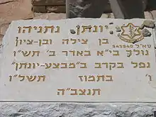 Netanyahu was killed in action on July 4, 1976, while commanding the rescue mission during Operation Entebbe.[12] He was the only Israeli soldier killed during the raid (along with three hostages, all of the Revolutionary Cells members, all of the Popular Front for the Liberation of Palestine members, and dozens of Ugandan soldiers). The commonly accepted version of his death is that Netanyahu fired on Ugandan soldiers, and was shot in response by a Ugandan soldier from the airport's control tower. The family refused to accept this verdict, and insisted instead that he was killed by the German commanding the hijackers.[13][14] Netanyahu was shot outside the building being stormed, and would soon die in the arms of Efraim Sneh, commander of the mission's medical unit.[15] The operation itself was a success, and was renamed as Mivtsa Yonatan ("Operation Jonathan" in English) in his honor.[12]