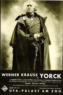 Yorck is a 1931 German war film directed by Gustav Ucicky and starring Werner Krauss, Grete Mosheim and Rudolf Forster.[1] It portrays the life of the Prussian General Ludwig Yorck von Wartenburg, particularly his refusal to serve in Napoleon's army during the French Invasion of Russia in 1812. It was a Prussian film, one of a cycle of films made during the era that focused on Prussian history.