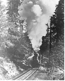 The current railroad follows a portion of grade originally carved into the mountain by the Madera Sugar Pine Lumber Company in the early 20th century. The company originated in 1874, when it was organized as the California Lumber Company to log the area surrounding Oakhurst, California.[1] The Madera Sugar Pine Lumber Company once had a large sawmill at Sugar Pine, California, just south of the current YMSPRR.[2] The railroad had seven locomotives, over 100 log cars, and 140 miles (230 km) of track in the surrounding mountains.[3] In addition to the railroad, the Company also transported lumber in a flume that stretched 54 miles (87 km) from Sugar Pine to Madera, California.[4] This was the most efficient way to transport rough cut lumber out of the mountains for finishing and transport at the bottom of the mountain. The Madera Sugar Pine Lumber Company practiced clearcutting, which removed almost every single tree within the stands of timber surrounding the YMSPRR track. The thick forest surrounding YMSPRR today belies this history, although large stumps from the original old growth timber dot the forest floor lining the tracks.
