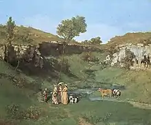 Courbet first exhibited the work at the Paris Salon in April 1852 entitled The Village Maids give alms to a cowherd in a valley near Ornans - this was the first time in thirty years he had first exhibited a work there.[4] It was immediately bought by the duc de Morny despite a public and press polemic against the work - for example, the art critic Théophile Gautier expressesd reservations and felt the canvas was under-finished,[5] whilst Gustave Planche, Eugène Loudun and Louis Énault felt it flouted the rules of perspective in the smallness of the figures relative to the cows - they also held the portrayal of the young women to be "rather ugly" and "incongruously diminished". The painting was displayed again in the 1855 Exposition universelle, provoking yet more criticism, this time against "this representation of provincial women dressed in Parisian fashion" provoking discomfort in its viewers. The painting provoked as much or even more discussion about Courbet as his Burial at Ornans and according to Michael Fried was one of his "breakthrough canvases" as part of a deliberate strategy to arouse scandal.[6]