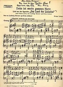 "Yours Is My Heart Alone" or "You Are My Heart's Delight" (German: "Dein ist mein ganzes Herz") is an aria from the 1929 operetta The Land of Smiles (Das Land des Lächelns) with music by Franz Lehár and the libretto by Fritz Löhner-Beda and Ludwig Herzer. It was for many years associated with the tenor Richard Tauber, for whom it was written. The aria is sung by the character of Prince Sou-Chong in act 2. An American version of the show opened on Broadway in 1946 starring Tauber but it soon closed as Tauber had throat trouble.[1]