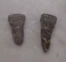 For the teeth, only the left and right first incisors are preserved for the Yuanmou Man. The left incisor measures 11.4 mm (0.45 in) in breadth and 8.1 mm (0.32 in) in width, and the right incisor 11.5 mm (0.45 in) and 8.6 mm (0.34 in).[8] The incisors are overall robust. They notably flare out in breadth from bottom to top. The labial (lip) side is mostly flat with the exception of some grooves and depressions, and the base is somewhat convex like that of the Peking Man. The lingual (tongue) side caves in like that of the Peking Man, but has a defined ridge running down the middle like H. (e?) ergaster and H. habilis. The cross section at the neck of the tooth (at the gum line) is nearly elliptical.[2][8] Similar anatomy is also exhibited in Late Pleistocene archaic human specimens from Xujiayao, China; and Neanderthals from Krapina, Croatia.[11]