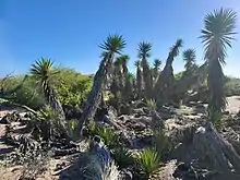 Yucca valida is a large, branched species up to 7 m (23 feet) tall. Leaves are rigid and lance-like, up to 35 cm (14 inches) long. Dead leaves hang onto the plant below the living leaves, forming a skirt around the trunk. Flowers are white, forming juicy, edible black fruits up to 4.5 cm (1.8 inches) long.[4][5][6]