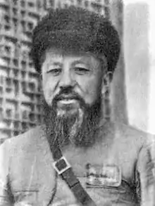 Yulbars Khan (Uighur: يۇلبارس خان, Uighur: يۇلۋاس خان (يولبارس خان), 'Tiger'; Chinese: 堯樂博斯; pinyin: Yáolèbósī or Chinese: 堯樂博士; pinyin: Yáolèbóshì; 13 August 1889 – 27 July 1971), courtesy name Jingfu (景福), was a Uyghur chieftain and Kuomintang general during the Chinese Civil War. He entered the service in the Kumul Khanate of Muhammad Khan of Kumul and later his son Maksud Shah.[4][5] He served as an advisor at the court, until when Maksud died in March 1930, governor Jin Shuren abolished the khanate.[6] Yulbars then conspired with Khoja Niyaz and Ma Zhongying to overthrow Jin in the Kumul Rebellion.[7][8][9] According to some people, Ma restrained Yulbars from traveling to Nanking to ask the Kuomintang for help, Ma earlier had an agreement with the Kuomintang that if he seized Xinjiang, he would be recognized by the Kuomintang as its leader.