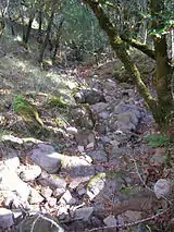 The Yulupa Creek watershed was below the Pacific Ocean floor as recently as the Miocene era, around which time massive uplift and volcanic action formed the massif which comprises the headwaters higher elevations of the watershed of today. Elevations within the drainage basin of Yulupa Creek range from about 430 to 1800 feet (130 to 550 meters) above sea level. Sandstone is the dominant rock type, as a remnant of the ancient sea floor. Slopes within the headwaters area commonly range from 15 to 30 percent, and lower reaches have gradients of two to five percent. One of the major soil associations within the upper elevation riparian zone is Goulding cobbly clay loam, which contains roughly 25 percent cobblestones, as well as some basaltic exposures, betraying the volcanic past of the Sonoma Mountains formation.[8] Typical soil depths in the headwater area range from 14 to 20 inches (35 to 50 centimeters). Much of the soil type in the Yulupa Creek riparian zone consists of Laniger loam, with rhyolite outcrops, another relic of the igneous history.