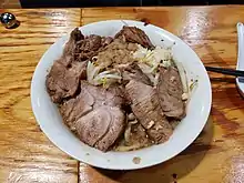 The restaurant only offers one dish: a bowl of ramen either in regular or “extra pork” (buta) sizes which vary based on the amount of chāshū, served alongside cabbage and bean sprouts, as well as options for extra fat and garlic.[3] The ramen base is made from a tonkotsu broth that cooks for 14 hours, giving it a rich flavor, combined with a shōyu broth and hand-cut noodles.[2] The dish itself has been described by The Boston Globe as being "porky, garlicky, hefty, [and] intense",[9] with prospective diners waiting in line for it every day,[2] sometimes for over an hour.[1]