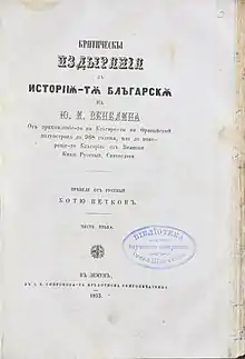 Venelin was the author of The old and today's Bulgarians in their political, ethnographic, historical and religious relations to the Russians, published in three volumes from 1829 to 1841.[3] The work has been credited for popularizing the Bulgarian culture and history in the Russian Empire and influencing the national feelings of many Bulgarian émigrés.[4][2]