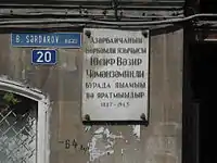 But authorities eventually managed to track Vazirov down in Urganj in 1940 and they arrested him. He was brought back to Baku for a drawn-out interrogation that lasted six months. Chamanzaminli learned that Bakir Chobanzade, a Crimean Tatar poet, had implicated him.[16] Clearly from photos, it can be seen that Vazirov was tortured during his interrogation period. None of his family members were allowed to visit him during this time but transcripts of the "interrogations" show that he never admitted to the Soviet government's false accusations, nor did he implicate any fellow Azerbaijanis in an attempt to get his own sentence reduced. Condemned on fabricated charges, Vazirov was sentenced to eight years of labor camps, which he served at Unzhlag at Sukhobezvodnaya railway station, Gorky Oblast, Russia. He died of malnutrition, disease, and heart break, three years after his arrest in January 1943.