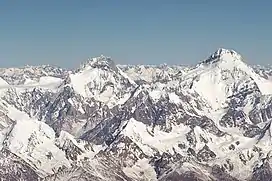 ![]() Aerial view of the Karakorams: Yukshin Gardan Sar (left) and Kanjut Sar (right), Yutmaru Sar is directly in front of Yuksin Gardan Sar | |