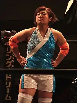 She also competed in the DDT Peter Pan branch of events. At Ryōgoku Peter Pan 2016 on August 28, she teamed up with Hyper Misao and Shoko Nakajima in a losing effort to Akane Miura, Miyu Yamashita and Yuka Sakazaki.[14] At Ryōgoku Peter Pan 2017 on August 20, she won a Rumble rules match for the Ironman Heavymetalweight Championship also involving Mizuki, her trainer Cherry, Yuna Manase, Maho Kurone and others.[15]
