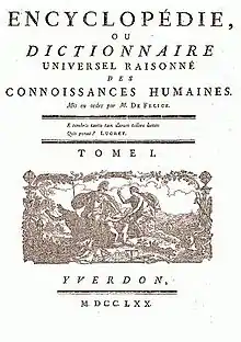 The Encyclopedia, the Dictionary of Universal Human Knowledge, or Encyclopédie ou dictionnaire universel raisonné des connaissances humaines, was an Encyclopedia compiled by Fortunato Bartolomeo de Félice, 2nd Count di Panzutti, published between 1770 and 1780 in Yverdon. Less anti-religious, in comparison to that of Diderot and d'Alembert on which it was based, this difference earned him the alternative title Protestant Encyclopedia, and ensured a strong distinction in Northern Europe.