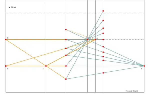 These ordinates are positioned on the abscissa in strict accordance with the proportions of the sun gears' teeth numbers relative to those of their rings. Consequently, the output ratios on the ordinate C4 (carrier of the last planetary gearset RS4) follows closely to those of the actual transmission. Note that elements A and F are labelled interchanged (cf. legend below).