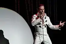 ![]() Zachary Oberzan performing in his film/theater/musical hybrid, The Great Pretender, deSingel Theatre Antwerp 2016 | |