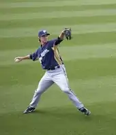 On December 17, 2010, Greinke reportedly asked the Royals to trade him, claiming that he was not motivated to play for a rebuilding team.[37] The Royals were unlikely to afford signing Greinke to a long-term deal once he became a free agent, so they agreed to trade him for some quality prospects.[38] On December 19, he was traded to the Milwaukee Brewers with Yuniesky Betancourt and $2 million for Alcides Escobar, Lorenzo Cain, Jeremy Jeffress, and Jake Odorizzi. He was given the number 13, instead of his preferred number 23, due to number 23 already being issued to Rickie Weeks.[39] Greinke would later admit that he handled the trade request poorly, saying that he was "pretty rude" on the way out,[40] but the deal worked out well for both teams.[41]