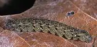 The larvae have been recorded feeding on dead, browned, lightly moistened leaves of Abies balsamea, Tsuga canadensis, Pseudotsuga menziesii, Hamamelis virginiana and Lonicera morrowii. They are mottled in brown, red, and yellow with a conspicuous pale subdorsal spot.