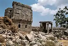 The tower stands 30 meters southeast of the church,[1] at the end of a long stoa.[1] The two-story military structure[5] is 4m2, and has a molded stringcourse with an inscribed date of 500 CE.[1] This tower was likely commissioned by a priest Simeon, and built by the architects Eusebius and Jean. An ecclesiastical recluse may have lived in this tower, as the bottom floor could have functioned as a chapel, with the upper floor for living quarters. There are two doors and a small arched window. The north door has a deteriorated roundel carving with recluse symbolism.[6]