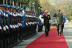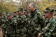 During his first week as chief of the general staff, he represented Serbia during the opening of the NATO liaison office in Serbia.[13] Ponoš was in amidst of media attention in April 2007, when some politicians argued that Ponoš should be replaced due to his pro-Western comments.[14] Dragan Šutanovac replaced Stanković as defense minister in May 2007.[15] Four days later, Ponoš traveled to the United States where he met with the US chief of staff.[16] Ponoš commented in October that "the army would not protect war criminals that were convicted by ICTY".[17] Later in December, Ponoš and Šutanovac stayed for several days near administrative lines with Kosovo in order to observe the situation, which they later stated to be "peaceful" and that "destabilization in this part of Serbia is not expected".[18] In October 2008, he met with army representatives of Turkey and Norway.[19][20] A month later, he expressed his support to change the Kumanovo Agreement.[21][22]