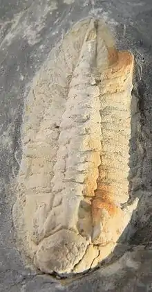 The cephalon has a rather narrow frontal area, and the anterior sections of the facial sutures run close to frontal lobe anteriorly. The large mosaic (schizochroal) eyes reach far backward. The main body (or thorax) is composed of eleven segments. The side lobes (pleurae) of the thorax curve stronger backward closer to the tail shield (or pygidium), their pointed tips longer than those of anterior pleurae. The pygidium is elongate subtriangular with the axis narrowly triangular reaching the back of the pygidium and consisting of about 10 rings. The pleural fields have 3 or 4 ribs.[1]