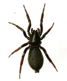 Zelotes subterraneus is one of a group shiny, all-black Zelotes species which are difficult to identify,[2] the females being extremely similar and the males only being readily identifiable by reference to the tip of the embolus on the palps.[4] The overall picture is additionally complicated by the apparent hybridisation between the two species in some areas,[5] but this is disputed with some authorities claiming apparent hybrid characteristics may be the result of natural variation.[4]