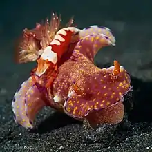 | Zenopontonia rex on a sea slug Ceratosoma trilobatum. | |