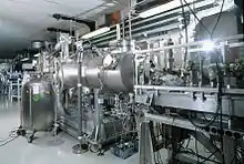 - ELBE is a Center for High-Power Radiation Sources and HZDR's largest research facility. It encompasses a superconducting Electron Linear accelerator for beams with high Brilliance and low Emittance (ELBE) and two FEL for the mid and far infrared spectra. In addition, the electron beam delivers multiple other secondary beams (quasi-monochromatic X-rays, polarized Bremsstrahlung, pulsed neutron beams and pulsed mono-energetic positrons).[3]