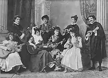 In England in 1888, they billed themselves as "The Zerega Spanish Troubadours", consisting of "two on mandolin and guitar, with tambourine, castanet and fairy-bell accompaniments", appearing at the Royal Albert Hall, West Theatre.[10] They also toured as "Zerega's Spanish Minstrels".[2] On August 17 and 21 August 1895, "These famous Mandoline and Guitar Players, Singers, and Dancers had the honour of appearing before her Majesty the Queen [Victoria] [at] Osborne House",[11] and performed the following programme:[12]