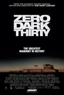 Zero Dark Thirty is a 2012 American thriller film directed by Kathryn Bigelow and written by Mark Boal. The film dramatizes the nearly decade-long international manhunt for Osama bin Laden, leader of terrorist network Al-Qaeda, after the September 11 attacks. This search leads to the discovery of his compound in Pakistan and the military raid where bin Laden was killed on May 2, 2011.