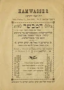 Upon returning to Iași he became very involved in literary and theater life once again.[1] He wrote a number of theatrical works: Bal shem (a play in five acts, staged in Iași with Kalman Juvelier in 1891–1892), Bal nes (four acts, staged in Iași with Juvelier in 1893), Pantilemon, and Ruth, a five-act opera which was never staged, Gog umogeg (a revue staged in Iași in 1920), Der yarid in himl (a one-act play), and Dos litvakl.[5][4][9] He also wrote for and edited a number of newspapers and magazines: Hayoyets, Folksblat, Yudishe Tsukunft, and Hamevaser, Helman's own literary magazine which he published from 1903 onwards.[1][6][5] For some time in the 1890s he also quit the theater and became a Hazzan in a synagogue again, although he soon returned to Yiddish songwriting.[2]