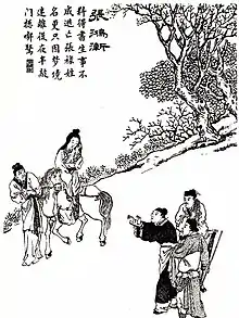 ![]() Zhang Hongjian encounters Shi and Shunhua while being escorted to the capital, in a 19th-century illustration from Xiangzhu liaozhai zhiyi tuyong (Liaozhai Zhiyi with commentary and illustrations; 1886) | |
