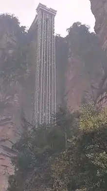 The Bailong Elevator, literally "hundred dragons sky lift", was opened to the public in 2002. At 326 m (1,070 ft), it is the world's tallest outdoor lift. It can transport visitors to the top from its foot in less than two minutes. The structure is composed of three separate glass elevators, each of which can carry up to 50 people at a time.