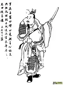 Zhuge Dan's son, Zhuge Jing, was sent as a hostage to Eastern Wu in 257 in return for support from Wu forces for his father's rebellion.[31] He remained in Wu and served as Minister of War (大司馬). In 280, after the Jin dynasty conquered Wu, Zhuge Jing went into hiding in the home of his sister (the one who married Sima Zhou). The Jin emperor Sima Yan (Emperor Wu) considered Zhuge Jing his relative (Sima Zhou was an uncle of Emperor Wu) and knew that Zhuge Jing was hiding in his sister's home, so he paid them a visit. When Zhuge Jing heard that the emperor had come to visit him, he hid in the latrine and refused to come out. The emperor insisted on seeing him and said, "Today, we finally meet each other again." Zhuge Jing replied tearfully, "I regret not being able to cover my body in paint and remove the skin from my face[lower-alpha 3] before I meet Your Majesty again!" Emperor Wu appointed him as a Palace Attendant (侍中), but he refused to accept, returned to his hometown and lived the rest of his life as a commoner.[51] Zhuge Jing had two sons: Zhuge Yi (諸葛頤) and Zhuge Hui (諸葛恢). Zhuge Yi served as Minister of Ceremonies (太常) during the Jin dynasty and was favoured by Emperor Yuan.[52] Zhuge Hui served as Prefect of the Masters of Writing (尚書令).[53]