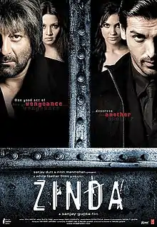 Zinda (English: Alive) is a 2006 Indian Hindi-language neo-noir action thriller film starring Sanjay Dutt, John Abraham, Lara Dutta and Celina Jaitly.[1] The film was directed by Sanjay Gupta and also wrote the film along with Suresh Nair. Vishal–Shekhar composed the film's thematic music, and background music composed by Sanjoy Chowdhury. It was released in India on 13 January 2006.