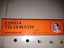 Zinda Tilismath is a Unani herbal medicine, which is used for treating many common ailments like cold, coughs, throat pain, body pain, stomach disorders, ear pain, tooth pain and many more. Based on the ancient herbal unani concept of medicine, Zinda Tilismath was founded by Late Hakim Mohammed Moizuddin Farooqui in the year 1920. This was the period when new industries were beginning to emerge on the surface of Hyderabad and were adding to the grandeur of Deccan. [1] It is an over the counter drug, which is made from selected herbs. The medicine is said to have no side effects due to its herbal composition and is based on the Unani concept of medicine. It's available across India in many medical and general shops.[2]