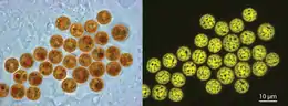 The coccoid cell is surrounded by a cellulosic, usually smooth cell wall that contains large-molecular-weight proteins and glycoproteins.[38][71] Cell walls grow thicker in culture than in hospite.[7] The cell membrane (plasmalemma) is located beneath the cell wall, yet little is known about its composition and function in terms of the regulation of trans-membrane transport of metabolites. During karyokinesis and cytokinesis, the cell wall remains intact until the mastigotes escape the mother cell. In culture, the discarded walls accumulate at the bottom of the culture vessel. It is not known what becomes of the walls from divided cells in hospite.[72] One species, S. pilosum, possesses tufts of hair-like projections from the cell wall; this is the only known surface characteristic used to diagnose a species in the genus.