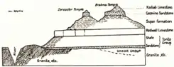 The summit spire of Zoroaster Temple is composed of cream-colored, cliff-forming, Permian Coconino Sandstone with a small, remnant Kaibab Limestone and Toroweap Formation caprock.[9] The sandstone, which is the third-youngest of the strata in the Grand Canyon, was deposited 265 million years ago as sand dunes. Below the Coconino Sandstone is slope-forming, Permian Hermit Formation, which in turn overlays the Pennsylvanian-Permian Supai Group. Further down are strata of Mississippian Redwall Limestone, Cambrian Tonto Group, and finally granite of the Paleoproterozoic Vishnu Basement Rocks at river level.[10] Precipitation runoff from this feature drains south into the Colorado River via Zoroaster and Bright Angel Canyons.