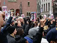 In November 2017, a group of anti-Piet demonstrators were prevented from attending a demonstration during a nationally-televised celebration in the town of Dokkum after their vehicles were blocked on the A7 motorway by pro-Piet demonstrators, 34 of whom were later charged and found guilty of obstructing traffic.[40] During intocht celebrations throughout November 2018, violent incidents took place in the cities and towns of Nijmegen, The Hague, Leeuwarden, Den Helder, Rotterdam, and elsewhere. In Eindhoven, anti-Piet demonstrators were surrounded by an estimated group of 250 people described as "football hooligans" who attacked them with eggs and shouted racist insults. A similar protest in Tilburg led to the arrest of 44 pro-Piet demonstrators.[41]