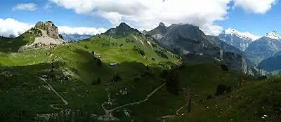 Gündlischwand lies in the Bernese Oberland in the Alps on the Black Lütschine river. The municipality includes the hamlet of Zweilütschinen, so named because it is the point of confluence of the White and Black Lütschine rivers. To the north of the Black Lütschine, the municipality extends up the Sägis Valley and its small lake, and includes the slopes up to the summits of the Schynige Platte, Loucherhorn, Roteflue, Faulhorn and Sägissa (2,465 m (8,087 ft)) mountains. Both the Schynige Platte Alpine Garden and the adjoining summit station of the Schynige Platte railway are within the municipality. To the south of the Black Lütschine, the municipality includes the north-western slopes of the Männlichen.[4]