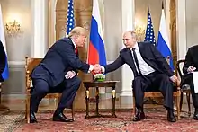 The 2018 Russia–United States summit was a summit meeting between United States President Donald Trump and Russian President Vladimir Putin, also known as the Trump–Putin summit which was hosted by the President of Finland Sauli Niinistö in Helsinki, Finland on 16 July 2018. The Finnish Ministry of Foreign Affairs officially titled the summit as the #HELSINKI2018 Meeting. Stated issues included improving bilateral ties between the two countries which had been deteriorating since the annexation of Crimea by Russia in 2014 and development of the U.S. Intelligence Community's assessment that Russia tried to meddle with the results of the 2016 U.S. elections.