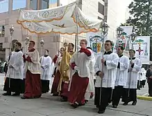 The Eucharist displayed in a monstrance, flanked by candles being adored by a kneeling altar server
