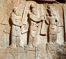 Investiture of Sassanid emperor Shapur II (center) with Mithra (left) and Ahura Mazda (right) at Taq-e Bostan, Iran.