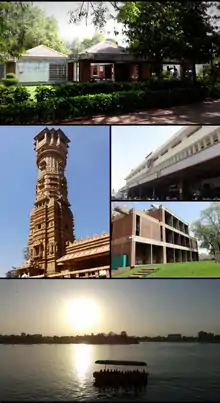 Clockwise from topː Gandhi Smarak Sangrahalay at Sabarmati Ashram, Ahmedabad Railway Station, CEPT University, Kankaria Lake and the Kirti Stambh at Hutheesing Temple.