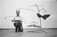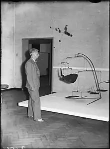 photo (1947): Willem Sandberg looking at Calder's mobiles in Stedelijk Museum, Amsterdam