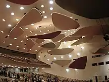 Calder, 1954: 'Acoustic Clouds'; - quote of Calder, 1962: 'What I like best is the acoustic ceiling in Caracas, in the auditorium of the university.. .It's made from great panels of plywood - some thirty feet long - more or less horizontal and tilted to reflect sound.'