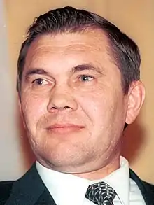 Alexander Ivanovich Lebed (Russian: Алекса́ндр Ива́нович Ле́бедь; 20 April 1950 – 28 April 2002) was a Soviet and Russian military officer and politician who held senior positions in the Russian Airborne Troops before running for president in the 1996 Russian presidential election. He did not win, but placed third behind incumbent Boris Yeltsin and the Communist Party leader Gennady Zyuganov, with roughly 14% of the vote nation-wide. Lebed later served as the Secretary of the Security Council in the Yeltsin administration, and eventually became the governor of Krasnoyarsk Krai, the second largest Russian region. He served four years in the latter position, until his death in a helicopter crash in 2002.