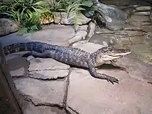 An alligator is a crocodilian in the genus Alligator of the family Alligatoridae. The two living species are the American alligator (A. mississippiensis) and the Chinese alligator (A. sinensis). Additionally, several extinct species of alligator are known from fossil remains. Alligators first appeared during the Oligocene epoch about 37 million years ago.